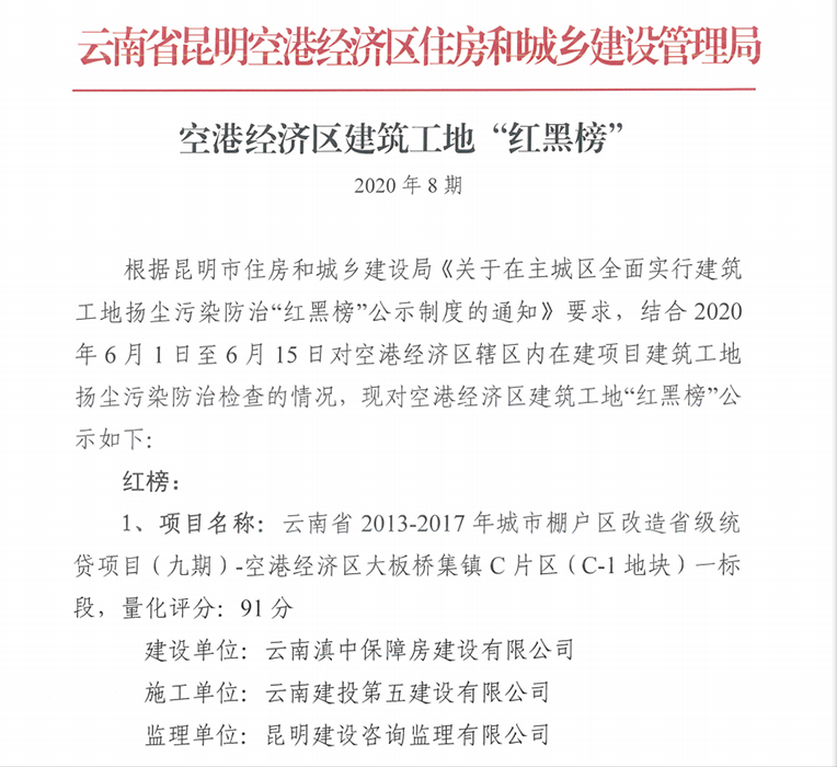此次“紅黑榜”是昆明空港經(jīng)濟(jì)區(qū)住房和城鄉(xiāng)建設(shè)管理局根據(jù)昆明市住房和城鄉(xiāng)建設(shè)局《關(guān)于在主城區(qū)全面實(shí)行建筑工地?fù)P塵污染防治“紅黑榜”公示制度的通知》要求,對(duì)空港經(jīng)濟(jì)區(qū)轄區(qū)內(nèi)在建的80多個(gè)建筑工地進(jìn)行了揚(yáng)塵污染防治情況檢查后評(píng)出的結(jié)果。