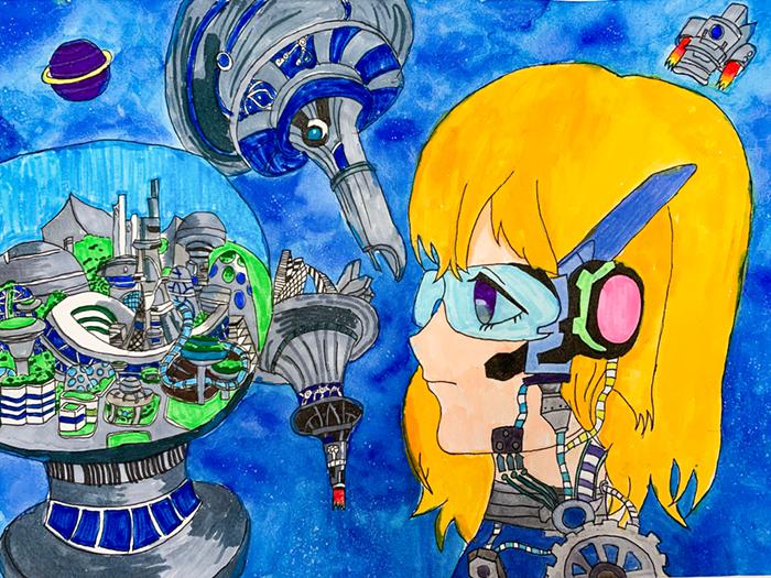 寓意:在茫茫的宇宙中,有著無數(shù)顆行星,其中最美麗的一顆星球就是月球,它就是未來世界。那么,未來世界是什么樣子的呢?它有著湛藍的皮膚,披著潔白的輕紗,畫中女孩可以控制未來世界,統(tǒng)治機器人,操控機器人,飛船、宇宙、城市、縮小版的未來世界,每個螺旋開關(guān),齒輪都有它們不同的功能,你只需要一鍵開啟,它就能快速運轉(zhuǎn)工作。月球上全是高科技全能設備,尤其適合人類居住生活,我們都在未來世界幸??鞓繁憬莸纳钪?。每天可以與星星說話,與太陽嬉戲,與外星人做朋友,在太空中自由的飛翔,在未來世界學習更多的高科技技能。