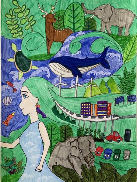 寓意:春姑娘披著一頭翠綠的長(zhǎng)發(fā)緩緩地朝我們走來(lái)了。輕柔的暖風(fēng)送來(lái)鳥(niǎo)兒的歡歌。各種新嫩枝葉都敞開(kāi)了胸懷,有翠綠的,嫩綠的,深綠的,一起享受著這從密葉林間穿透而過(guò)的初夏的陽(yáng)光。在這綠茵茵的發(fā)絲上風(fēng)車隨意的轉(zhuǎn)動(dòng)著一圈又一圈,青山綠草在春姑娘翠綠的發(fā)絲中探了出來(lái),城市的新地、高樓、高鐵、充電節(jié)能小汽車、還有風(fēng)力發(fā)電……一片欣欣向榮的景象沐浴著生活的陽(yáng)光,在飄逸長(zhǎng)發(fā)中搖曳。春姑娘那溫柔美好的眼神,甜甜的微笑,還有細(xì)微的眉頭,都能讓人感受到生命的美好,各種小動(dòng)物、植物也都隨著他們的腳步在春光中醒來(lái),展示著生命的可貴。