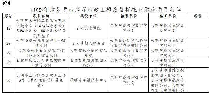 其中由公司承建的云南藝術(shù)學(xué)院二期工程藝術(shù)實(shí)踐中心(1#2#3#教學(xué)樓)及5#教學(xué)樓、6#教學(xué)樓建設(shè)項(xiàng)目施工、云南省婦女兒童發(fā)展中心建設(shè)項(xiàng)目、云南省林業(yè)高級(jí)技工學(xué)校(排危)建設(shè)項(xiàng)目、石林彝族自治縣民族初級(jí)中學(xué)建設(shè)項(xiàng)目、昆明市三環(huán)閉合工程?hào)|三環(huán)A段(羅衙立交至廣昌立交)等項(xiàng)目獲2023年度昆明市房屋市政標(biāo)準(zhǔn)化“示范項(xiàng)目”榮譽(yù)稱號(hào)。
