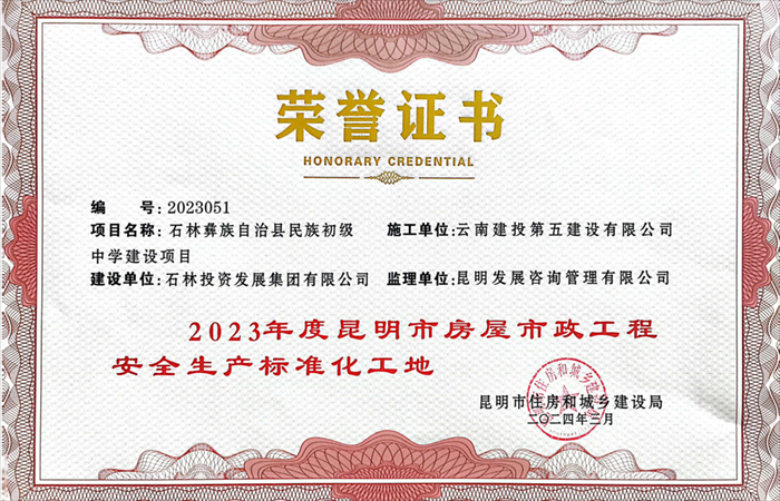 近日,由五〇二直管項(xiàng)目部負(fù)責(zé)施工的石林彝族自治縣民族初級中學(xué)建設(shè)項(xiàng)目獲評“昆明市2023年建筑企業(yè)目標(biāo)考核優(yōu)良單位”、“2023年昆明市房屋市政工程質(zhì)量標(biāo)準(zhǔn)化示范項(xiàng)目”、“2023年昆明市房屋市政工程安全生產(chǎn)標(biāo)準(zhǔn)化工地”等榮譽(yù)。