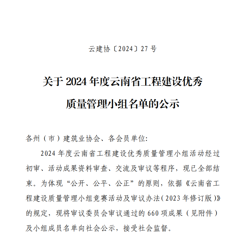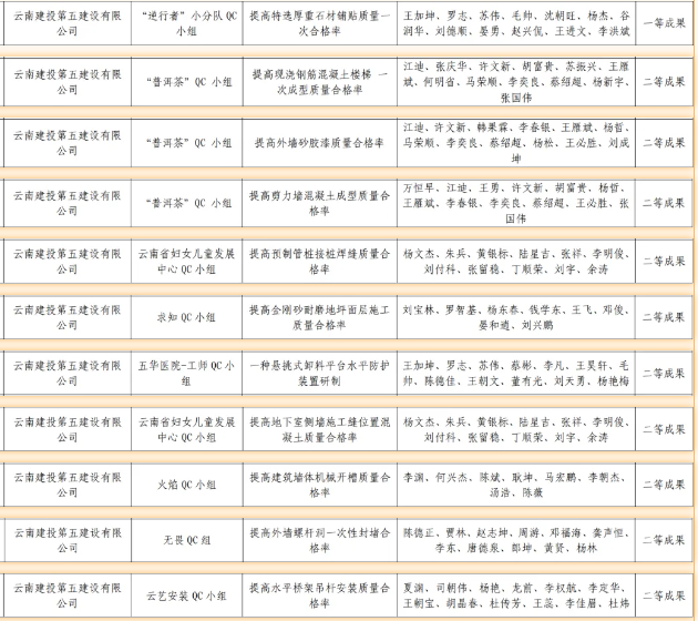 近日,昆明市建筑業(yè)協(xié)會(huì)、云南省建筑業(yè)協(xié)會(huì)及中國(guó)建筑業(yè)協(xié)會(huì)相繼頒發(fā)了2024年度工程建設(shè)質(zhì)量管理小組活動(dòng)成果,公司憑借精細(xì)化的過(guò)程質(zhì)量管理和精益求精的品質(zhì)管理,榮獲2024年度中國(guó)建筑業(yè)協(xié)會(huì)工程建設(shè)質(zhì)量管理小組成果二等獎(jiǎng)1項(xiàng)、云南省工程建設(shè)優(yōu)秀質(zhì)量管理小組成果11項(xiàng)、昆明市工程建設(shè)優(yōu)秀質(zhì)量管理小組成果4項(xiàng),獲評(píng)昆明市建筑業(yè)協(xié)會(huì)“質(zhì)量管理優(yōu)秀企業(yè)”榮譽(yù)稱(chēng)號(hào)。