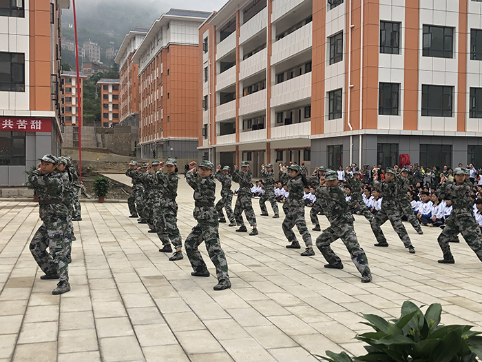 同學(xué)們在平整潔凈的青石地板上進行軍訓(xùn)匯報演出