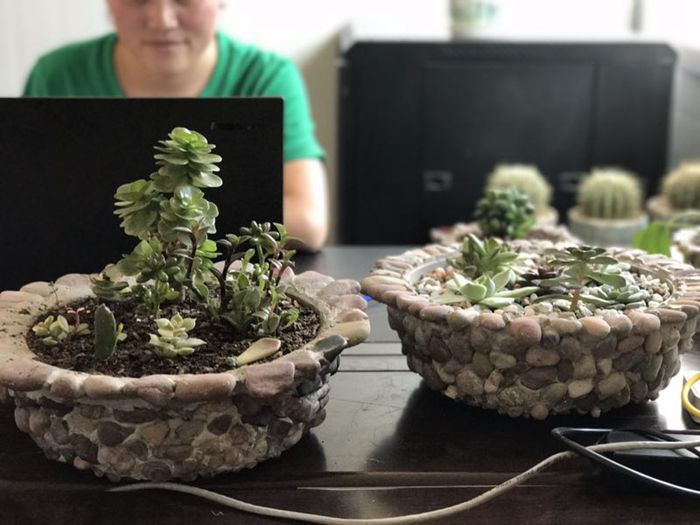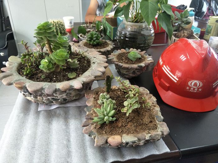 技術(shù)支持: 方森科技 今天晚飯時經(jīng)過材料室,無意間發(fā)現(xiàn)袁老師傅和小尤拿著一桶小石子和小半袋水泥在那搗鼓著什么,仔細(xì)一看,眼前的一幕讓我眼前一亮,只見他們一人拿著小鏟子兌著水?dāng)嚢杷?,一人在塑料盒周圍擺上小石子,不一會兒的功夫,一個個漂亮的小花盆閃亮登場啦。別說,這用塑料盒、水泥和小石子做出來的花盆還真是漂亮,再放上泥土,種上多肉植物,擺放在辦公桌上,真是這繁忙的項目駐地處里的“一股清流”啊。細(xì)問才知道,原來,這些漂亮花盆的材料都是“原生態(tài)”來的,塑料盒是吃完洗干凈的塑料飯盒,水泥是他們在水泥車卸貨的時候掃下來的水泥渣,就連小石子也都是從澄江邊上撿回來的。利用這些材料,袁老師傅和小尤親手“打造”出了辦公室里的一道靚麗的風(fēng)景。