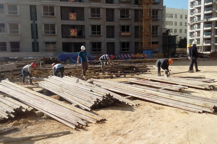 在這太陽高照、風(fēng)一吹到處都是塵土飛揚(yáng)的條件下,項(xiàng)目部退休返聘老職工材料主管李壽萍親自對(duì)現(xiàn)場的鋼管、扣件進(jìn)行收撿堆碼。一開始只有材料主管李壽萍及材料員劉小明在收撿,不一會(huì)兒項(xiàng)目經(jīng)理李朝松、技術(shù)負(fù)責(zé)人楊濤、主工長李兆林、工長劉忠全等管理人員看到這情景也陸陸續(xù)續(xù)加入進(jìn)來。管理人員們個(gè)個(gè)汗流浹背,人多力量大,不一會(huì)兒的功夫現(xiàn)場的周轉(zhuǎn)材料就堆碼完成。