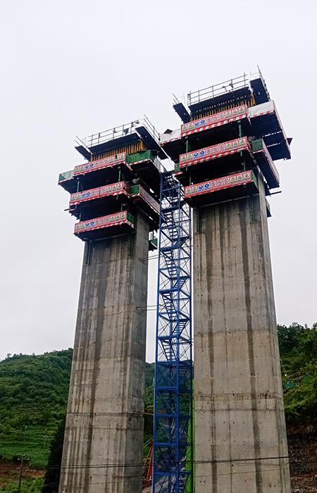本次澆筑完成的13#墩右幅墩高52米,左幅墩高51米,空心墩橫橋向等截面長度為6米,縱橋向坡比為80:1,空心墩身壁厚0.5m,橫隔板按照墩頂實心段起向下9米設(shè)置一道,墩底實心段向上9米設(shè)置一道,其余橫隔板在兩道之間按8米左右均布設(shè)置,橫隔板厚0.4米,項目部根據(jù)總體施工組織策劃安排及現(xiàn)場實際情況,投入2套液壓爬模對13#墩兩棵空心薄壁墩同時進行施工,施工過程中人員上下采用定型化梯籠,安拆方便的同時也確保施工安全。