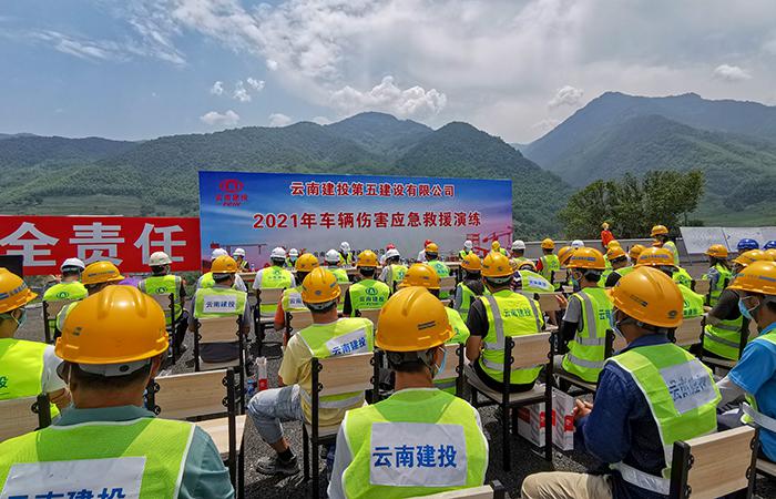 8月4日,公司在路橋三部永金高速項目一分部舉行2021年二季度“車輛傷害”應(yīng)急演練活動。玉溪市永金高速公路投資建設(shè)有限公司副總經(jīng)理徐斌、公司副總工程師何家軍、公司安全總監(jiān)伏見偉出席活動。