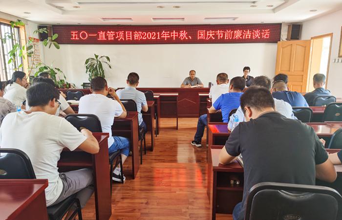 9月6日下午,五〇一直管項目部開展中秋、國慶節(jié)前廉潔談話,會議由黨支部書記王敏主持,直管部班子成員、科室負(fù)責(zé)人及項目經(jīng)理共計21人參會。