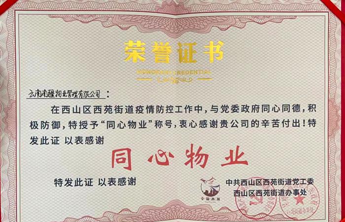 近日,公司南疆物業(yè)收到昆明市西山區(qū)西苑街道辦事處寄來(lái)的感謝信。西苑街道辦事處對(duì)南疆物業(yè)公司積極響應(yīng)號(hào)召、義無(wú)反顧參加社區(qū)疫情防控工作致以崇高的敬意和衷心的感謝,并授予“同心物業(yè)”稱號(hào)。