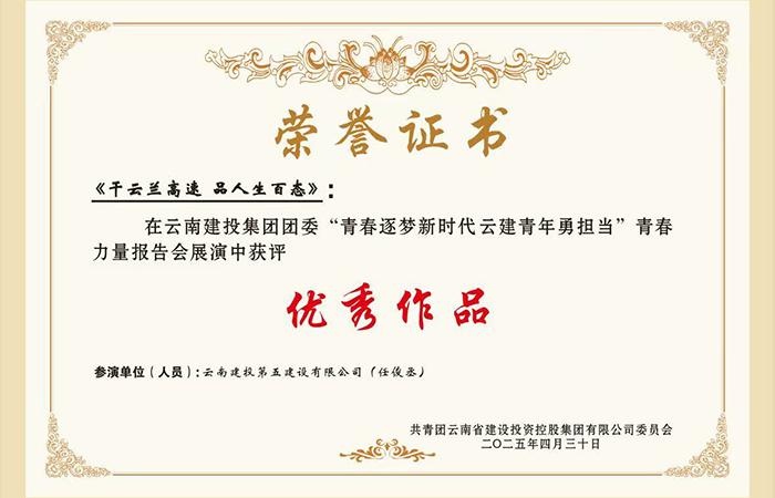2025年五四青年節(jié),集團(tuán)舉辦“青春逐夢新時(shí)代 云建青年勇?lián)?dāng)”青春力量報(bào)告會。展演中,由公司團(tuán)委、市政路橋四部聯(lián)合編創(chuàng)的脫口秀《干云蘭高速,品人生百態(tài)》作品獲評“優(yōu)秀作品”。