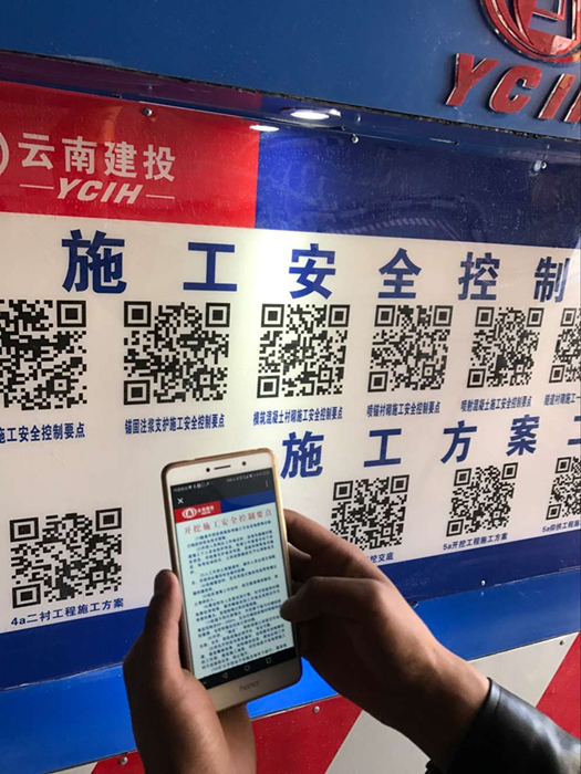 二維碼掃描平臺位于古那灣2號隧道進(jìn)口端洞外的休息區(qū)及洞口人車分流區(qū)的人行道上,涵蓋施工安全控制要點(diǎn)、施工方案、作業(yè)指導(dǎo)書、安全技術(shù)交底、安全操作規(guī)程等施工工藝、規(guī)范和安全、技術(shù)、質(zhì)量管理內(nèi)容。進(jìn)入施工現(xiàn)場前如需查詢相關(guān)資料,可直接通過手機(jī)掃描二維碼進(jìn)行查詢,操作非常方便。就算施工員不小心忘記了施工技術(shù)交底中的某個數(shù)據(jù),只要輕松掃一掃就能全部“收入囊中”,巧當(dāng)施工現(xiàn)場的“教科書”。