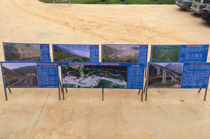該效果圖展板包括標段總平面圖、標段內控制性工程古那灣連續(xù)剛構橋、松園橋互通立交及連接線、古那灣2號隧道及忠義3號大橋、兩家村1號大橋、兩家村2號大橋、兩家村3號大橋共計7幅。