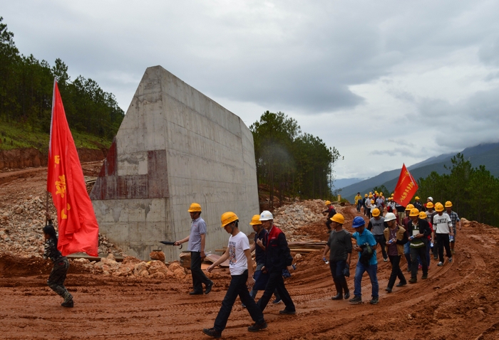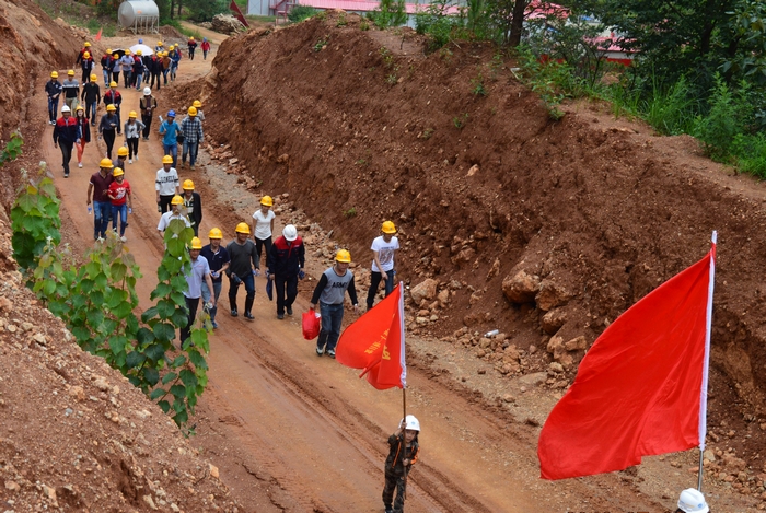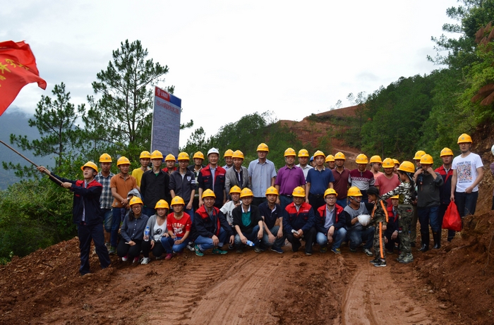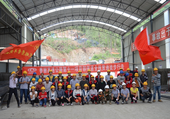 徒步隊(duì)伍中還有兩個(gè)放假來(lái)到工地探望父母的小旗手,其中大一點(diǎn)的小旗手扛著項(xiàng)目部的青年突擊隊(duì)隊(duì)旗走完全程,小一點(diǎn)的在父母及項(xiàng)目部叔叔的幫助下也走完了全程。徒步隊(duì)伍走到半路時(shí),還與前來(lái)項(xiàng)目調(diào)研的公司領(lǐng)導(dǎo)不期而遇,大家一起在貫通的便道中途合了影,為整個(gè)行程留下了美好的回憶。