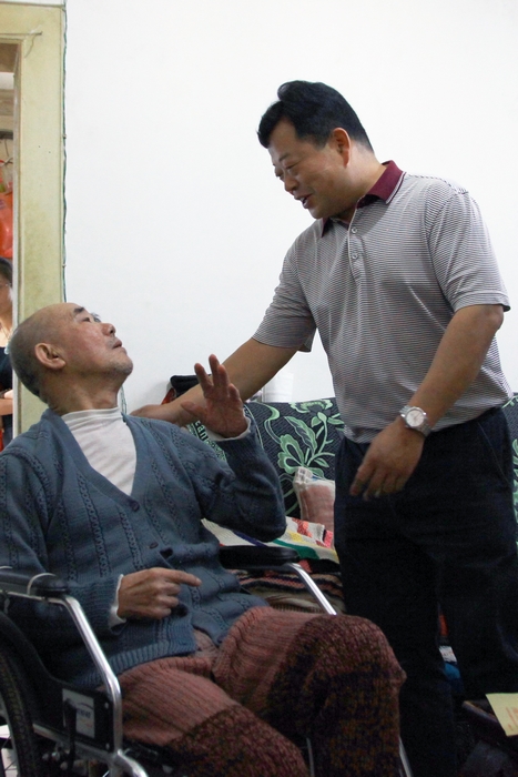 “別起來,別起來,您躺著就行了。”一到退休職工黃瑞泉老人家里時,老人便迫不及待地想要起身迎接,李興奎趕緊到臥室去幫忙攙扶。黃瑞泉患有腦梗且偏癱多年,生活不能自理,在其老伴的幫助下坐上輪椅來到了客廳。李興奎仔細(xì)詢問了黃瑞泉的身體狀況和其子女的相關(guān)情況,并向黃瑞泉老人送上了節(jié)日慰問金,“這是公司的一點心意,預(yù)祝你們節(jié)日愉快!你要好好休息,保重身體,有什么困難就向退管會反映,我們一定會盡力幫助解決?!?71歲的黃瑞泉顫顫巍巍地拉著李興奎的手不斷地道謝:“謝謝你們!謝謝書記!”