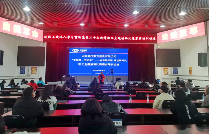 12月6日下午,公司工會以《“中國夢·勞動美”——奮進新征程?建功新時代》為主題的深入學習貫徹黨的二十大精神職工主題演講比賽賽前培訓講座在公司禮堂順利開展。各基層單位參加演講比賽的選手、工會主席、工會干事以及熱愛演講的職工同志等60余名干部職工參加線下培訓,培訓同時通過“云南建投第五建設有限公司”釘釘群進行實時直播,200余名干部職工同步參加此次線上培訓。本次培訓特別邀請到云南演講學會副會長徐俊波…