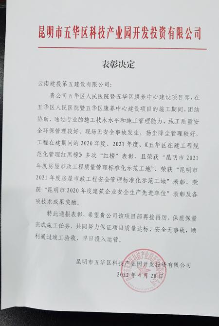 近日,公司收到昆明市五華區(qū)科技產(chǎn)業(yè)園開(kāi)發(fā)投資有限公司的表彰文件,對(duì)第三直管部施工的五華區(qū)人民醫(yī)院暨五華區(qū)康養(yǎng)中心建設(shè)項(xiàng)目表示肯定。文件中指出,五華區(qū)人民醫(yī)院項(xiàng)目在施工期間,通過(guò)專(zhuān)業(yè)的施工技術(shù)水平和施工管理能力,使得工程的質(zhì)量較好,施工現(xiàn)場(chǎng)的安全環(huán)保管理情況較好、現(xiàn)場(chǎng)無(wú)安全事故發(fā)生、揚(yáng)塵降塵效果較好,在2020年度、2021年度榮獲多項(xiàng)表彰,希望項(xiàng)目部再接再厲,保質(zhì)保量完成施工任務(wù)。 五華區(qū)人民醫(yī)院…